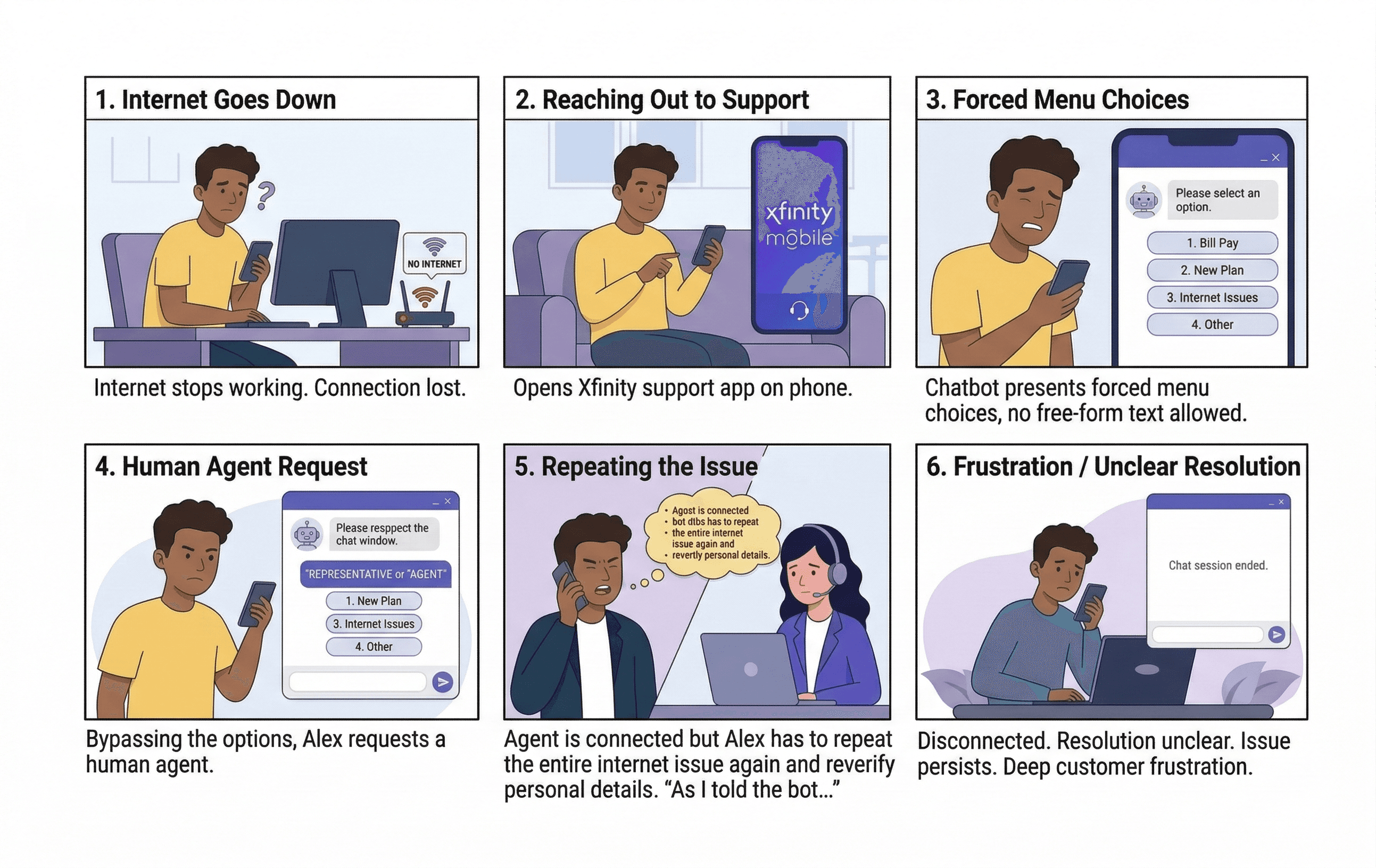 This project explores how to improve customer support in telecom services—focusing on the critical transition between AI chatbots and human agents. Using Xfinity as a case context, our team identified key pain points in the current support journey and designed a more seamless, transparent experience.