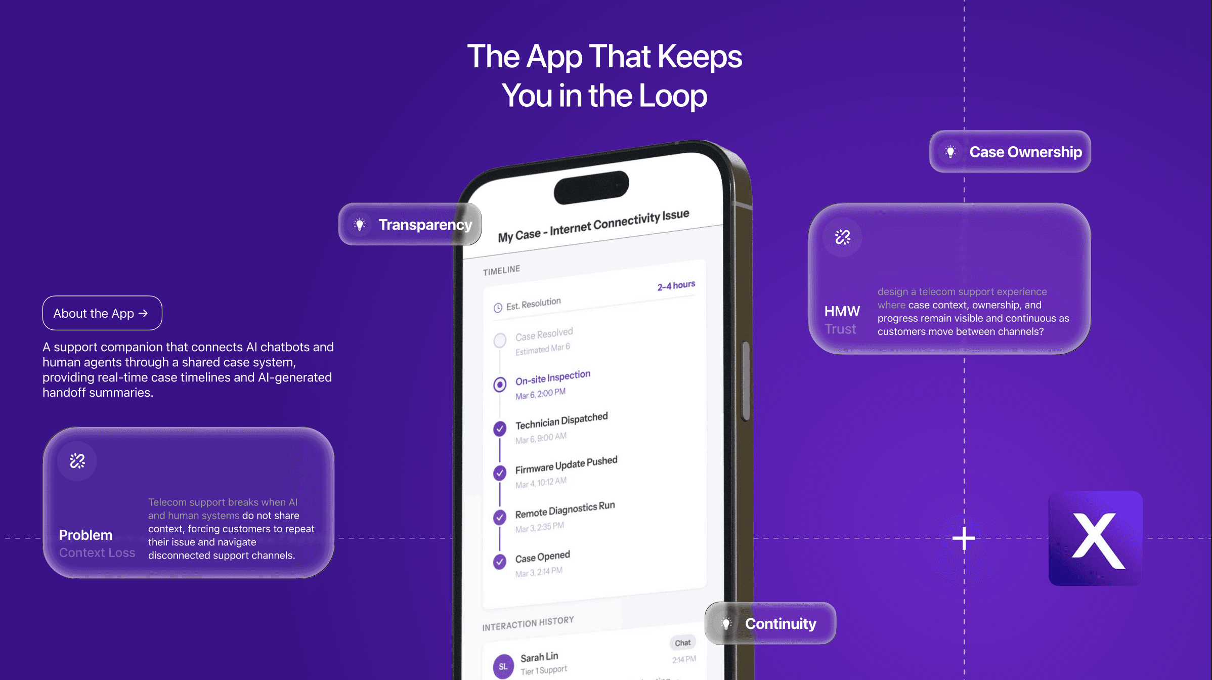 This project explores how to improve telecom customer support by addressing breakdowns between AI chatbots and human agents. Using Xfinity as a case context, I identified key pain points such as repetitive interactions and lack of continuity, and designed solutions like real-time case timelines and AI handoff summaries to create a more seamless and efficient support experience.