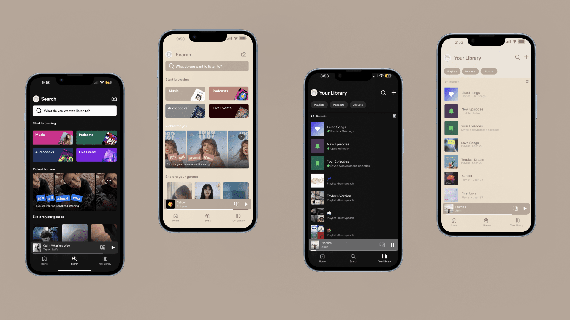 First UI project introducing a lighter, accessibility-focused UI concept that reimagines Spotify with a calm, beige visual identity.